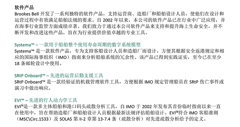 | 應用目的: | 支持和提升海上生命安全;幫助船舶設計符合“安全返港”要求 | 功能亮點: | Systema? 可模擬新造船系統(tǒng)并具體到組件層次,從而評估船舶設計是否符合“安全返港”要求;SRtP Onboard?可與Systema?配合,模擬船上系統(tǒng),指引船員依照“安全返港”要求在傷亡事故演戲中進行操作與行動;EVI?可以模擬船上乘客撤離疏散實況,評估船舶當前設計是否符合疏散要求,并高亮注明擁堵位置,為設計階段優(yōu)化全船布局提供參考。 |