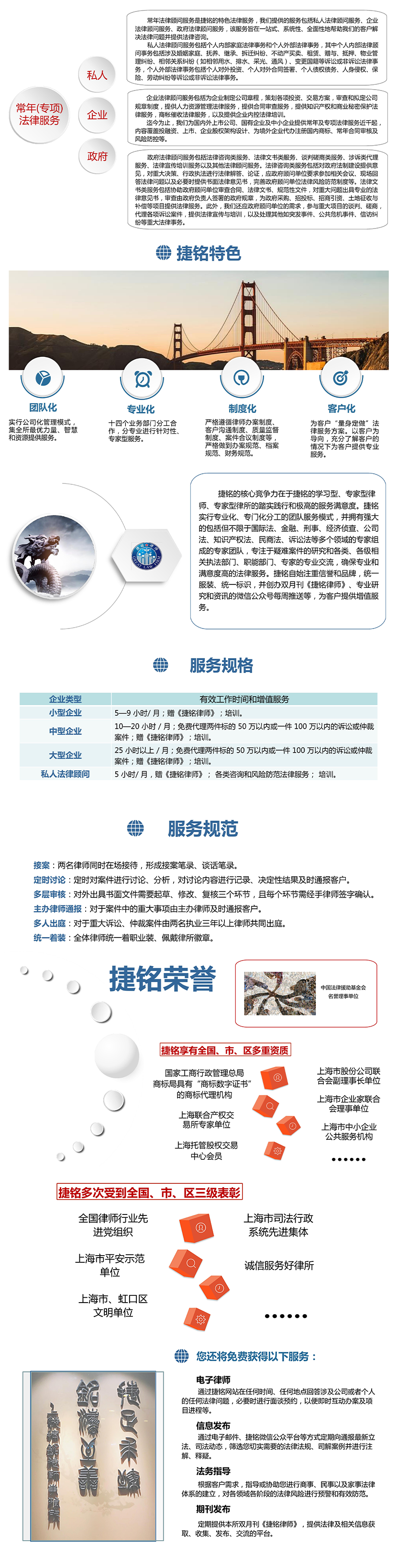 榮譽表彰: 中國法律援助基金會名譽理事單位;全國律師行業先進黨組織;上海市平安示范單位;上海市虹口區文明單位;上海市司法行政系統先進集體;誠信服務好律所等 計費方式: 依照服務規格按年收費