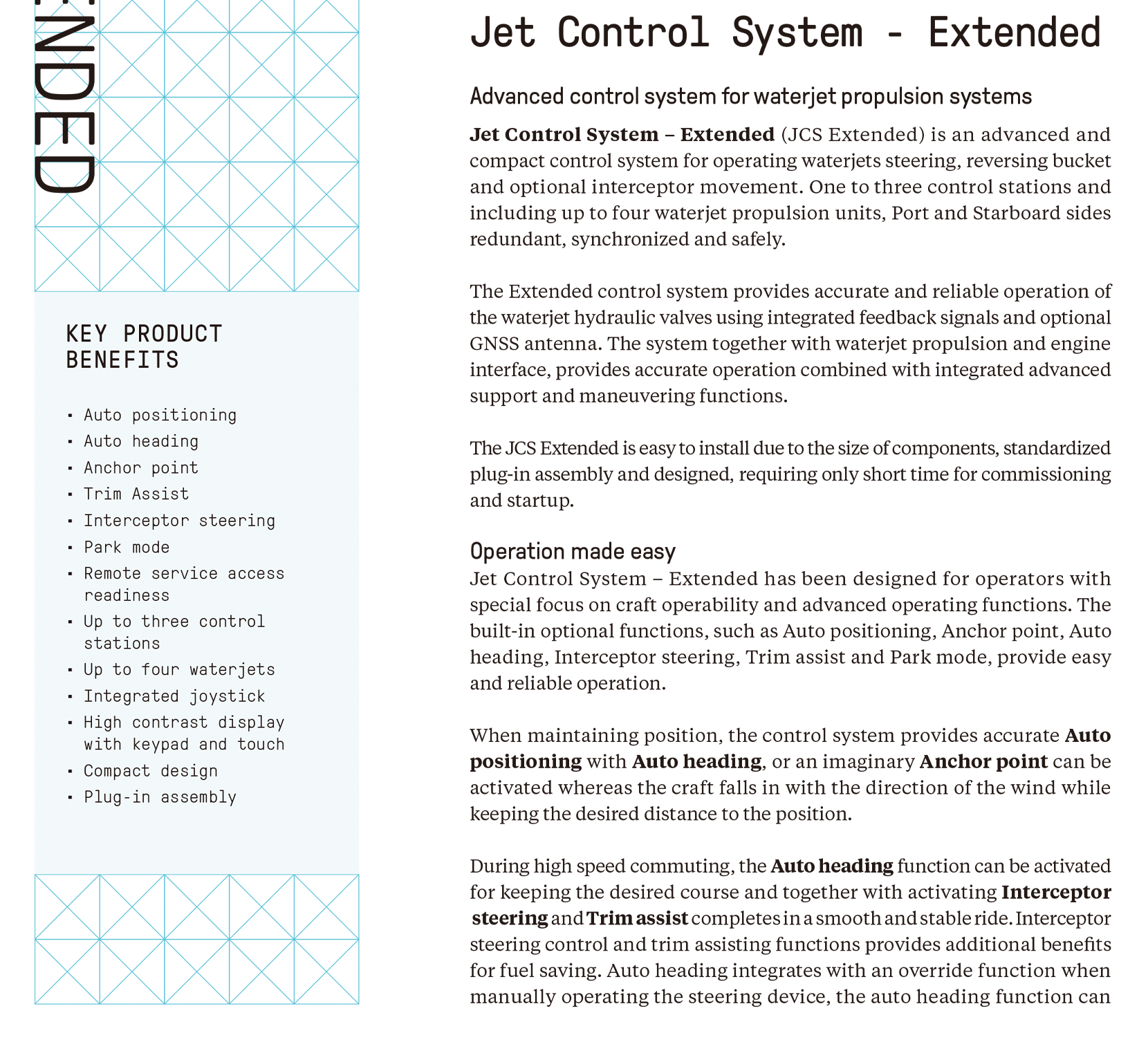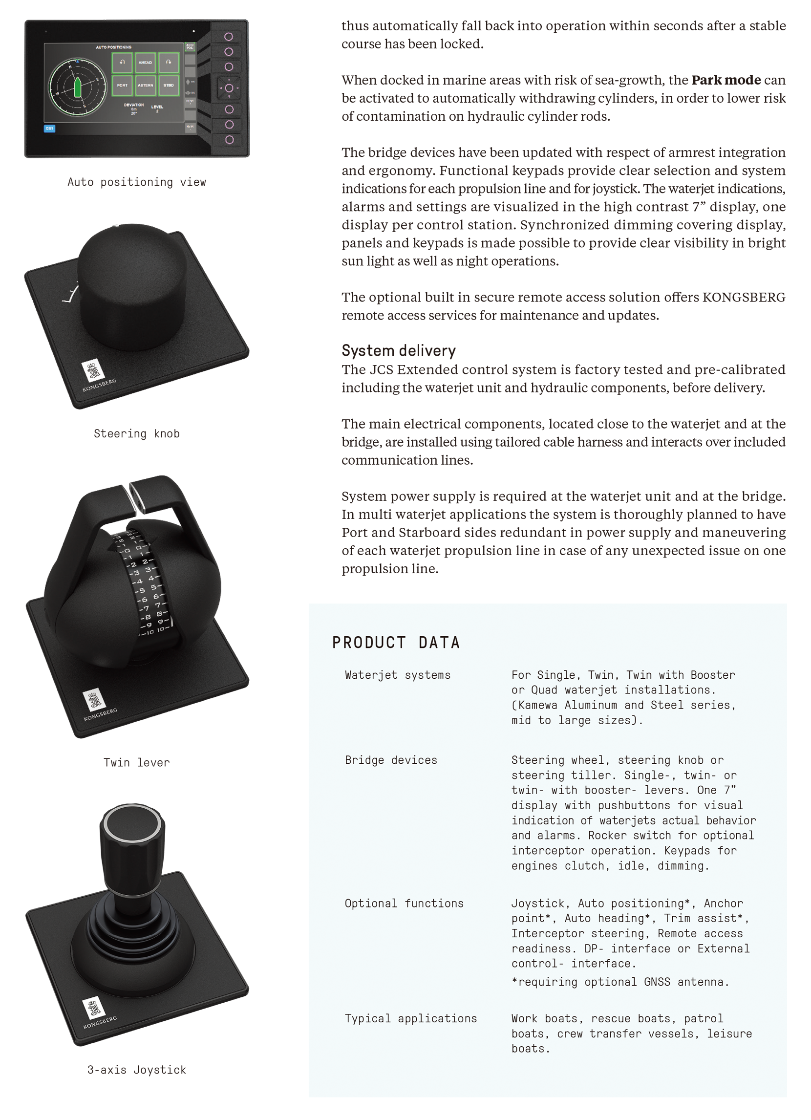 | 適用推進類型: | Kamewa Aluminum andSteel series, small to mid sizes | 供貨范圍: | ·Bridge devices, lever height 110mm, dept 65mm, steering wheel 320 mm ·Main components located with thewaterjet and at the bridge |